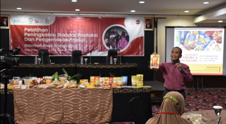 Yayasan Bangun Sejahtera Mitra Umat (Yayasan BSMU) bersama PT Bank Syariah Indonesia Tbk (BSI) melalui Direktorat Wakaf, Microfinance dan Digital Group Yayasan BSMU menggelar kegiatan Pelatihan Standar Produksi dan Pengemasan Produk bagi keluarga anggota program Bank Wakaf Mikro (BWM).