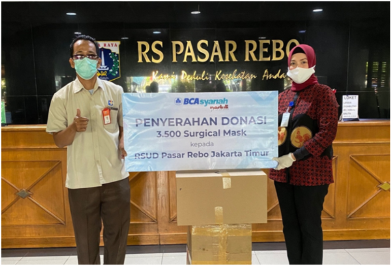 Dalam kesempatan kali ini BCA Syariah menyerahkan total 8.500 surgical mask kepada 6 rumah yaitu RSUD Pasar Rebo Jakarta; RS Wijaya, RS Bunda dan RS Gotong Royong di Surabaya; serta RS Melinda 2 dan RS Hermina Pasteur di Bandung.
