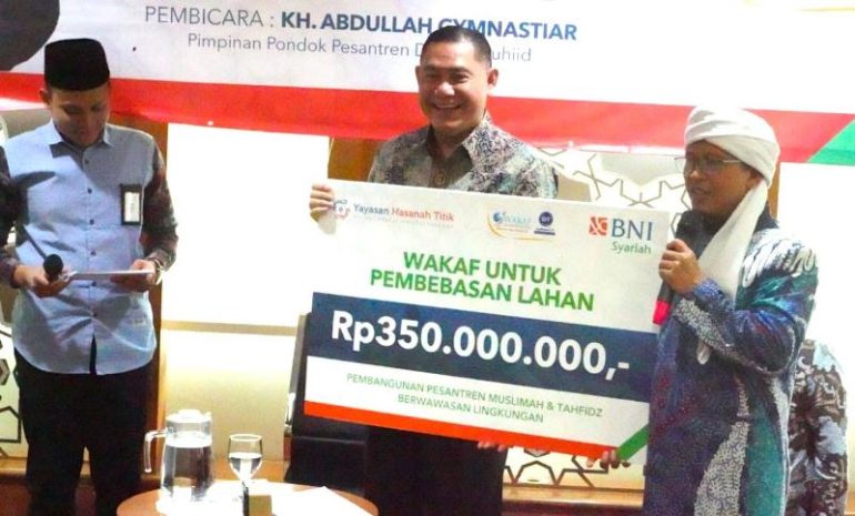 Dalam acara ini, juga dilakukan seremonial penyerahan simbolis dana wakaf dari BNI Syariah kepada Daarut Tauhid senilai Rp 350 juta untuk projek pembebasan lahan pembangunan ECO pesantren muslimah Daarut Tauhid di Bandung Barat.