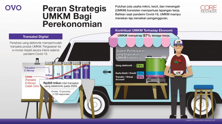 Di era pandemi, peran ekonomi digital dalam mendukung UMKM semakin nyata, bahkan sudah bisa dirasakan langsung oleh pelaku usaha di seluruh wilayah Indonesia. Survei yang dilakukan oleh CORE Indonesia di awal 2021 ini membuktikan, bahwa OVO berperan besar bagi pelaku UMKM Indonesia.