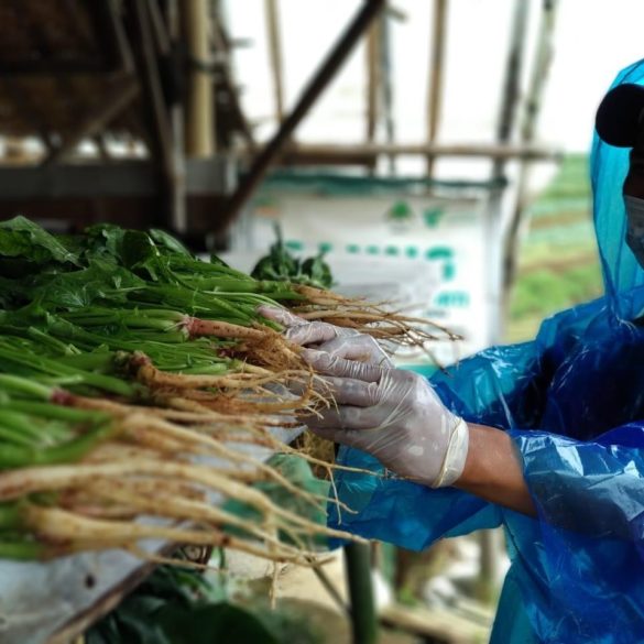 Bermodalkan alat pelindung diri (APD), para petani tetap setia memanen hasil tanam mereka pada Senin (23/3) di Cianjur, Jawa Barat....