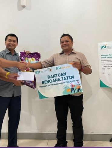 Hadir dalam penyerahan bantuan ini Kepala Cabang BSI Trenggalek – Ridwan; Area Operation Service Manager (AOSM) Area Kediri – Roxa...